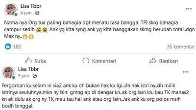 “Pengorbanan ku selama ini sia2 anak ku dah bukan hak ku lgi..dah hak istrinya..dah milik istrinya seutuhnya. Makannya bini ngomong apa didengarkan..aku org lain klu kau tak manas-manaskan aku dulu aku orgnya tak mau tau hal anak atau org lain,” kata Lisa dalam akun Facebook-nya, Rabu (18/10/2023).