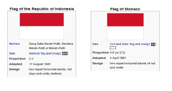 Sehingga jika kita lihat, bendera milik Indonesia terlihat lebih panjang dan ramping daripada bendera Monako yang cenderung lebih melebar mendekati bentuk persegi.