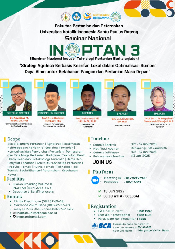 Ruteng, infopertama.com – Teknologi pertanian tidak bisa berjalan sendiri. Ia butuh akar budaya dan sentuhan kearifan lokal. Inilah semangat Universitas Katolik Indonesia Santu Paulus Ruteng ingin tegaskan melalui Seminar Nasional INOPTAN 3, yang akan berlangsung pada Jumat, 13 Juni 2025 secara daring via Zoom.