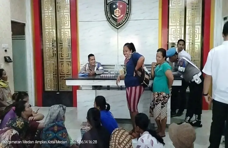 Puluhan mama-mama asal Desa Salam Tani Pancur Batu mendadak menggeruduk Kantor Propam Polda Sumut, Rabu 14 Juni 2023 Pukul 12.40 WIB.