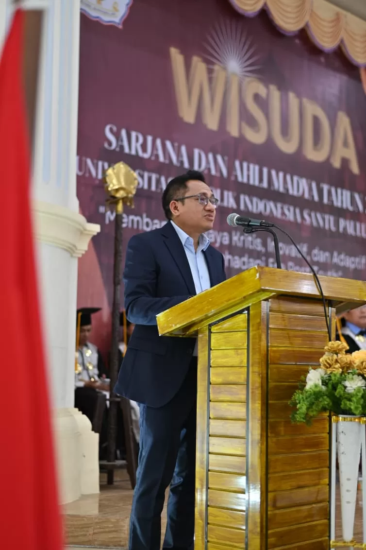 “Ijazah kalian adalah surat kepercayaan bahwa kalian siap membawa tiga kekuatan itu: kritis, inovatif, dan adaptif untuk memperbaiki dunia yang sedang sakit karena kehilangan kebenaran,” ungkapnya.