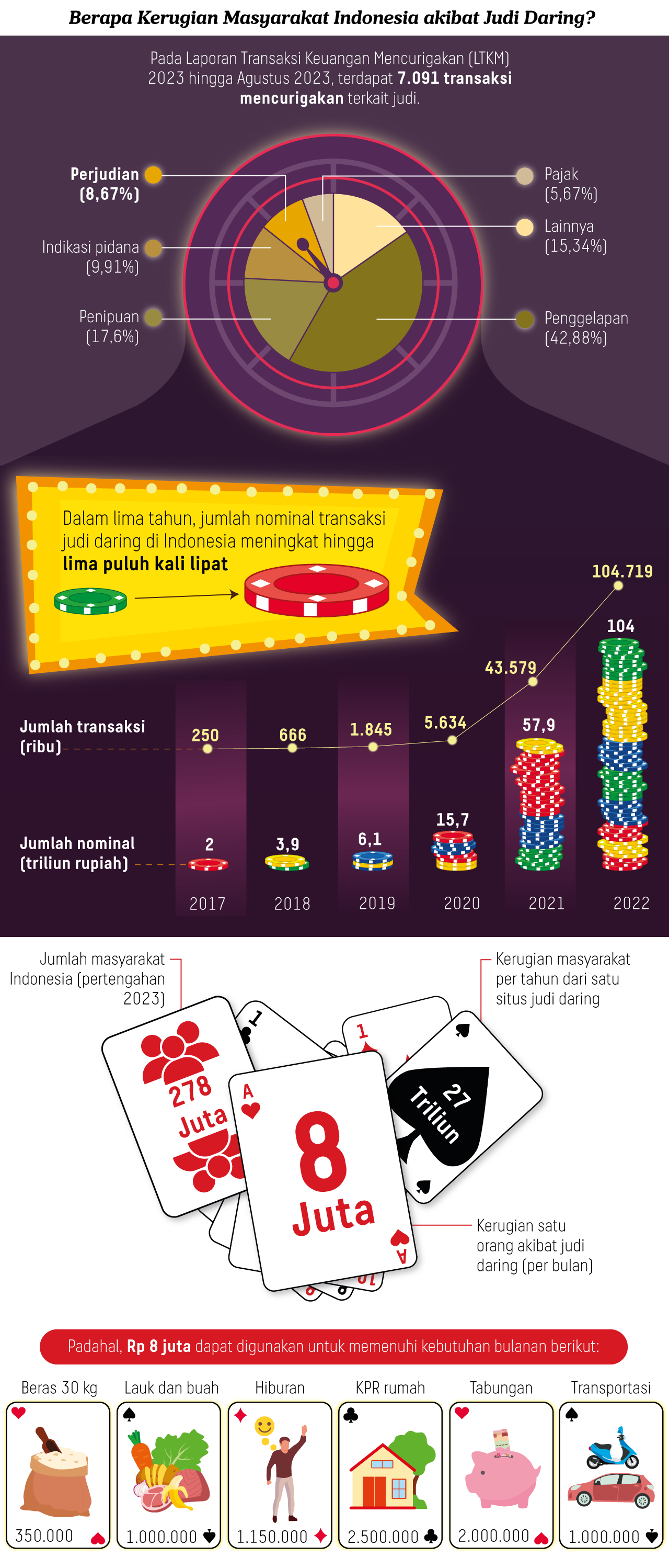 Jika ditotal selama bermain hampir dua tahun, nilai kerugian Andang dari judi online mencapai Rp800 juta. Saat ini, dirinya masih memiliki utang Rp180 juta. Istrinya punya usaha kuliner, pelan-pelan mencicilnya.