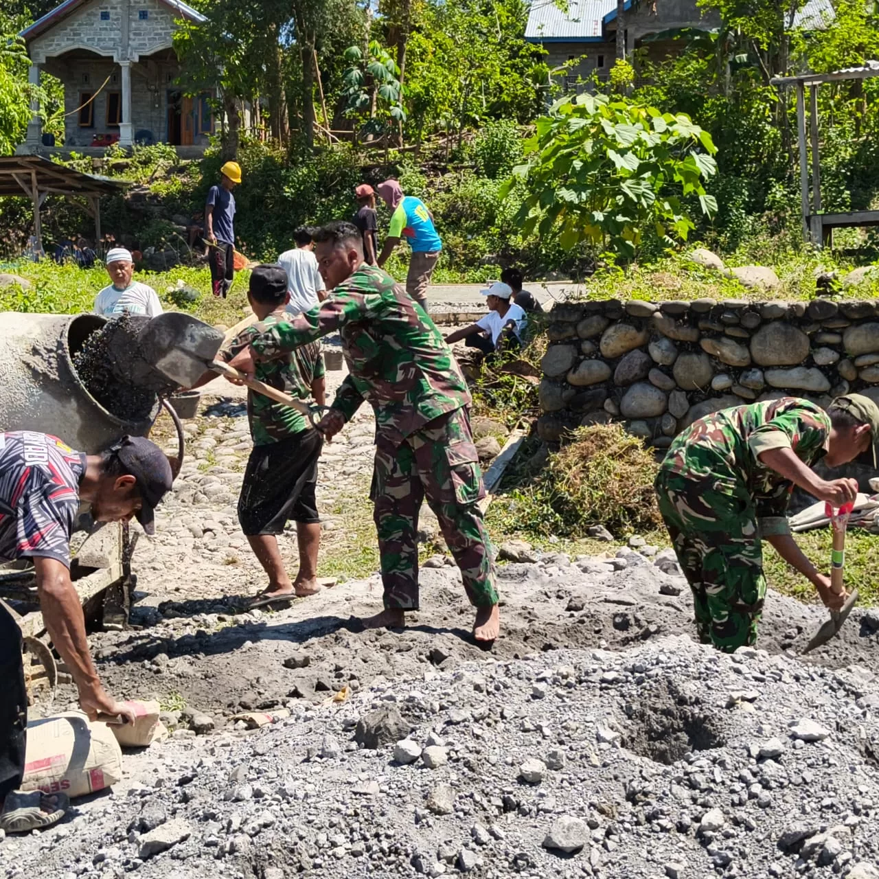 Di bawah terik matahari, prajurit TNI dan warga sipil bahu-membahu memperbaiki akses vital: jalan sepanjang kurang lebih 20 meter menuju Masjid Al-Bahar Wae Maras.