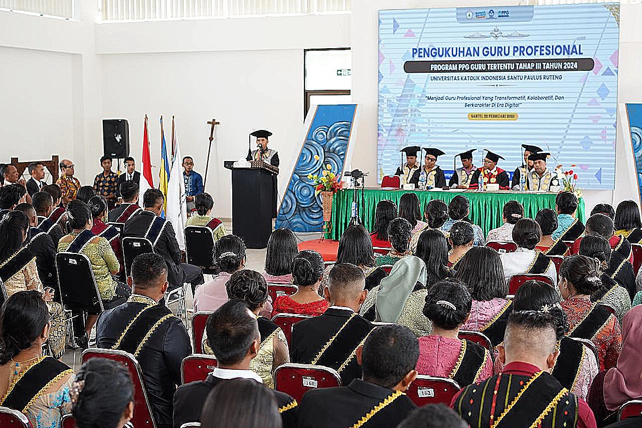 Ruteng, infopertama.com. Universitas Katolik Indonesia Santu Paulus Ruteng menggelar acara pengukuhan 1.010 Guru Profesional PPG GT Piloting 3 Tahun 2024 di Aula Gedung Utama (GUT) Lantai 5 pada Sabtu, 22 Februari 2025.