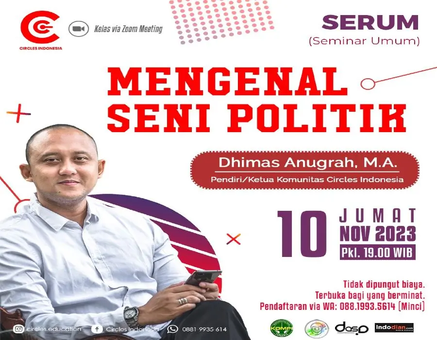 Jakarta, infopertama.com – Politik adalah seni, bukan sekadar usaha meraih kekuasaan. Dalam Seminar Umum Komunitas Circles Indonesia (via Zoom) yang bertajuk “Mengenal Seni Politik,” Ketua Circles Indonesia Dhimas Anugrah memaparkan bahwa politik adalah seni meraih dan mengelola kekuasaan bagi kesejahteraan masyarakat (Jakarta, 10/11/2023). Meski ada usaha meraih kekuasaan, tapi kekuasaan itu sejatinya tidak semata-mata ditujukan untuk kebaikan sekelompok kecil orang, melainkan menjadi alat untuk menyejahterahkan rakyat, terangnya.